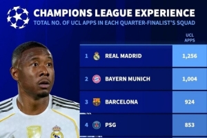 八强阵中球员欧冠总场次:皇马、拜仁、巴萨列前三 枪手仅多于葡体