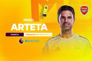 而在4月3日,阿尔特塔收获了英超3月最佳主帅,击败了埃迪·豪、赫尔泽勒、勒布里斯和莫耶斯。